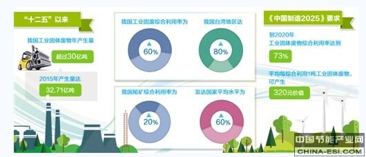 工业和信息化部节能与综合利用司司长高云虎说,“十二五”期间,我国5年利用大宗工业固废约70亿吨。《中国制造2025》要求:到2020年,工业固体废物综合利用率达到73%。