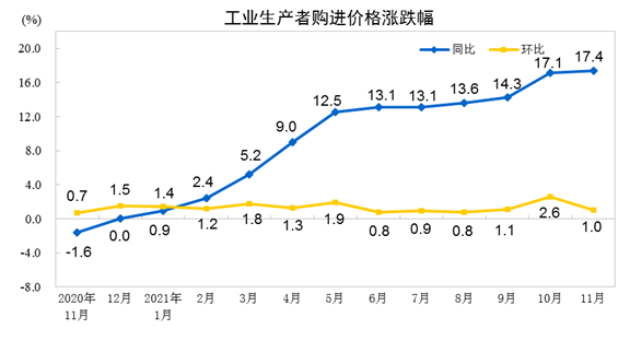 2021年11月份,全国工业生产者出厂价格同比上涨12.9%,环比持平;工业生产者购进价格同比上涨17.4%,环比上涨1.0%。1—11月平均,工业生产者出厂价格比去年同期上涨7.9%,工业生产者购进价格上涨10.7%。