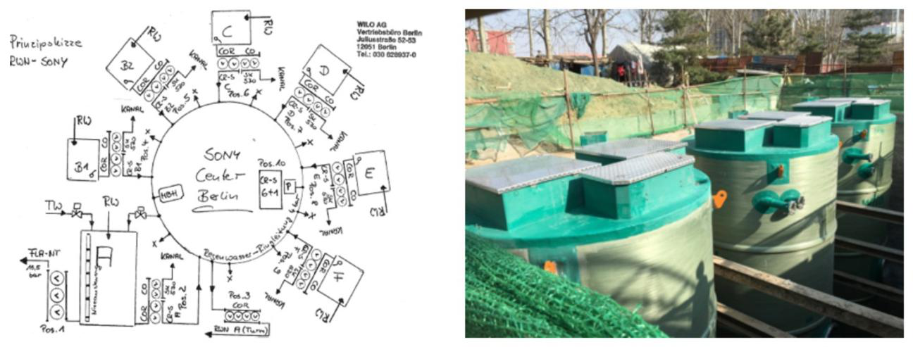 由于柏林市地下水位较浅,为了防雨水成涝,政府要求商业区建成后既不能增加地下水的补给量,也不能增加雨水的排放量。为此,索尼中心采取了特殊的设计来满足这些要求,将适宜建设绿地的建筑屋顶全部建成绿顶,利用绿地滞蓄雨水,通过带有过滤作用的雨漏管道进入主体建筑及地下的蓄水箱,经过过滤和沉淀后,再经过地下控制室的水泵和过滤器,一部分进入各大楼的中水系统用于冲刷厕所、浇灌屋顶的花园草地以及消防使用;另一部分被送往地上人工溪流和水池,形成雨水循环系统。地下总蓄水池又设有水质自动监测系统,当水面因蒸发而下降时,自动系统便会用蓄水箱中的水进行补充。