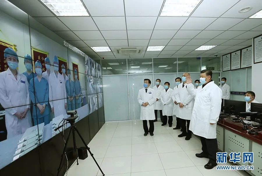 2月10日,习近平来到首都医科大学附属北京地坛医院门诊楼一层运行监控中心,通过监控画面察看患者住院诊疗情况,并视频连线正在病房值班的医务人员。