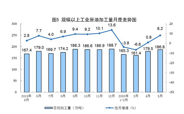 原油生产有所加快,加工量较快增长。5月份,生产原油1646万吨,同比增长1.3%,增速比上月加快0.4个百分点;加工原油5790万吨,增长8.2%,比上月加快7.4个百分点。1—5月份,生产原油8090万吨,同比增长1.9%;加工原油26139万吨,下降1.0%。