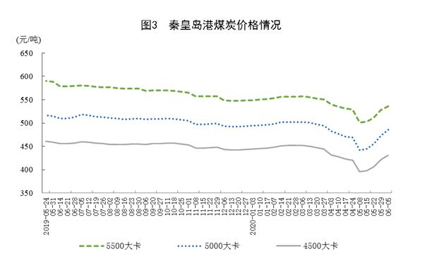 煤炭进口大幅下降,港口交易价格止跌回升。5月份,进口煤炭2206万吨,环比减少889万吨,同比下降19.7%;1—5月份,进口煤炭1.49亿吨,同比增长16.8%。港口煤炭综合交易价格止跌回升,6月5日秦皇岛港5500、5000和4500大卡煤炭价格分别为每吨536元、485元和431元,比5月8日的年内最低点分别回升35元、43元和35元。