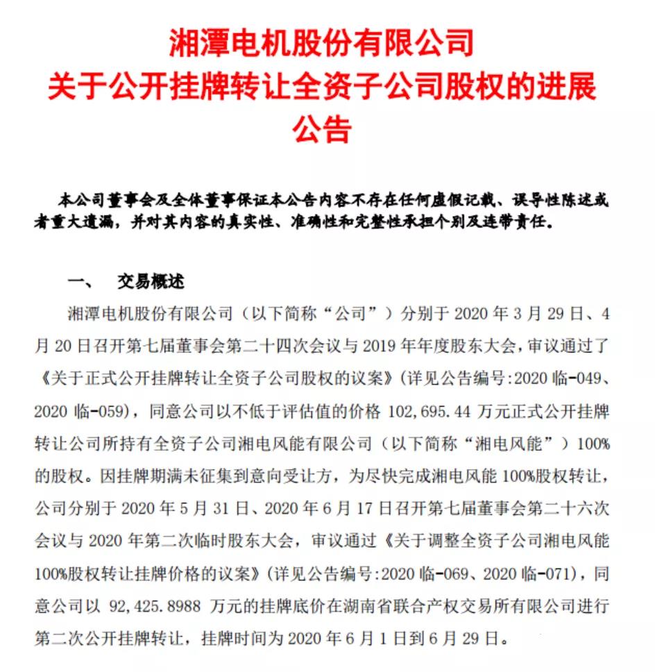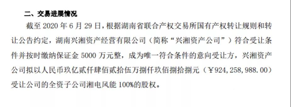 截至2020年6月29日,湘电风能100%股权受让公司终于落定,湖南兴湘资产经营有限公司(“兴湘资产公司”)符合受让条件并按时缴纳保证金5000万元整,成为唯一符合条件的意向受让方,股权收购价拟以人民币约9.24亿元。