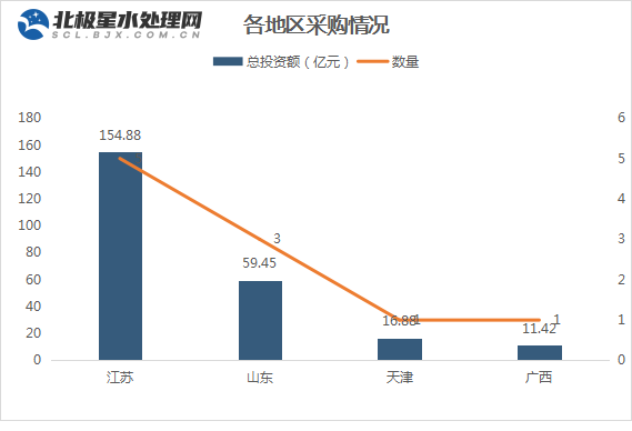 这10大10亿级农村污水处理项目中,主要集中于江苏和山东两大地区,其中江苏地区独占5席,总投资额达154.88亿元,投资总额占比高达64%。山东紧随其后,三大项目释放近60亿元市场。
