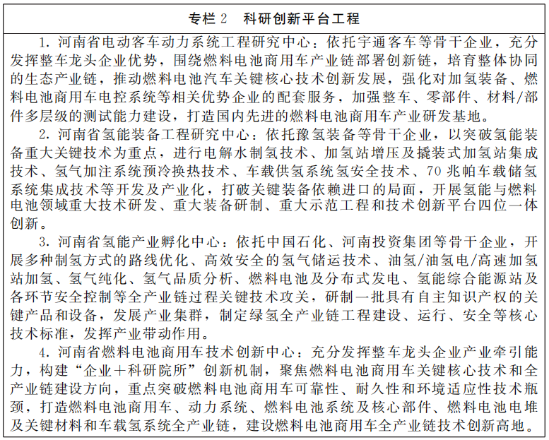 3.创新平台培育初显成效。宇通客车、豫氢装备等企业建成了客车安全控制技术国家地方联合工程实验室、河南省氢能装备工程研究中心等一批国家级、省级氢能领域工程实验室。宇通客车联合清华大学、同济大学等高校以及正星氢电、日立信等优势企业,组建了河南省氢能与燃料电池汽车产业研究院。濮阳市依托中国石化新能源产业研究院,联合国内氢能产业知名企业,组建了氢能产业联盟。新乡市政府与河南师范大学成立了新乡电池研究院。河南投资集团与上海交大、宇通客车与同济大学深度合作,在豫组建了科研团队。省级战略性新兴产业投资基金平台成立运营,新乡、濮阳等地氢能产业园基本建成。