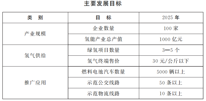 (二)工作目标。到2025年,突破氢能产业链关键零部件及系统集成核心技术,引进和培育产业链相关企业超过100家,打造国内领先的氢燃料电池整车及核心零部件生产企业2—3家,氢能产业年产值突破1000亿元。低碳低成本氢气供应体系初步建立,建成3—5个绿氢示范项目,适度超前布局建设一批加氢基础设施,氢气终端售价降至30元/公斤以下。氢燃料电池汽车推广应用达到5000辆以上,示范公交线路达到50条以上,示范物流线路达到10条以上,基本形成以货运车辆为主,客运车辆、乘用车等全面推广的氢燃料电池汽车应用格局。
