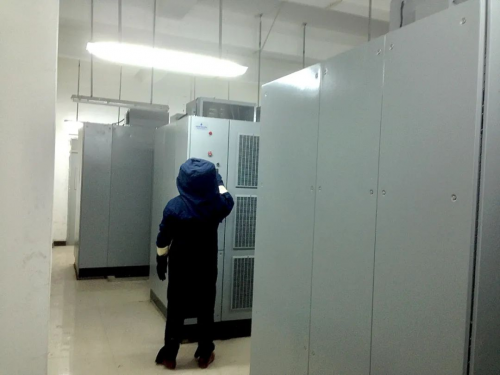 维谛调试专家穿高压防电弧服,在邯郸钢铁客户现场进行开机调试