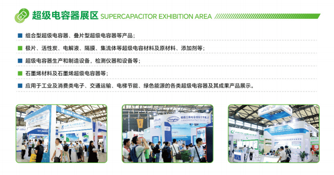 第十七届上海国际电池工业展览会、第十六届上海国际超级电容器产业展览会将集中展示多种电池技术和应用、超级电容器技术,包括各系列电池、各种组合电池、动力电池及管理系统、充电桩、充换电站及相关配套设施、储能应用及EPC工程、移动电源及相关产品、氢能及燃料电池技术与设备、电池用生产设备、测试仪器、原材料、零部件等。超级电容器包括组合型超级电容器、叠片型超级电容器、极片、活性炭、电解液、隔膜、集流体等超级电容材料及原材料、添加剂、超级电容器生产和制造设备,检测仪器和设备、石墨烯材料及石墨烯超级电容器、应用于工业及消费类电子、交通运输、电梯节能、绿色能源的各类超级电容器及其成果产品展示。