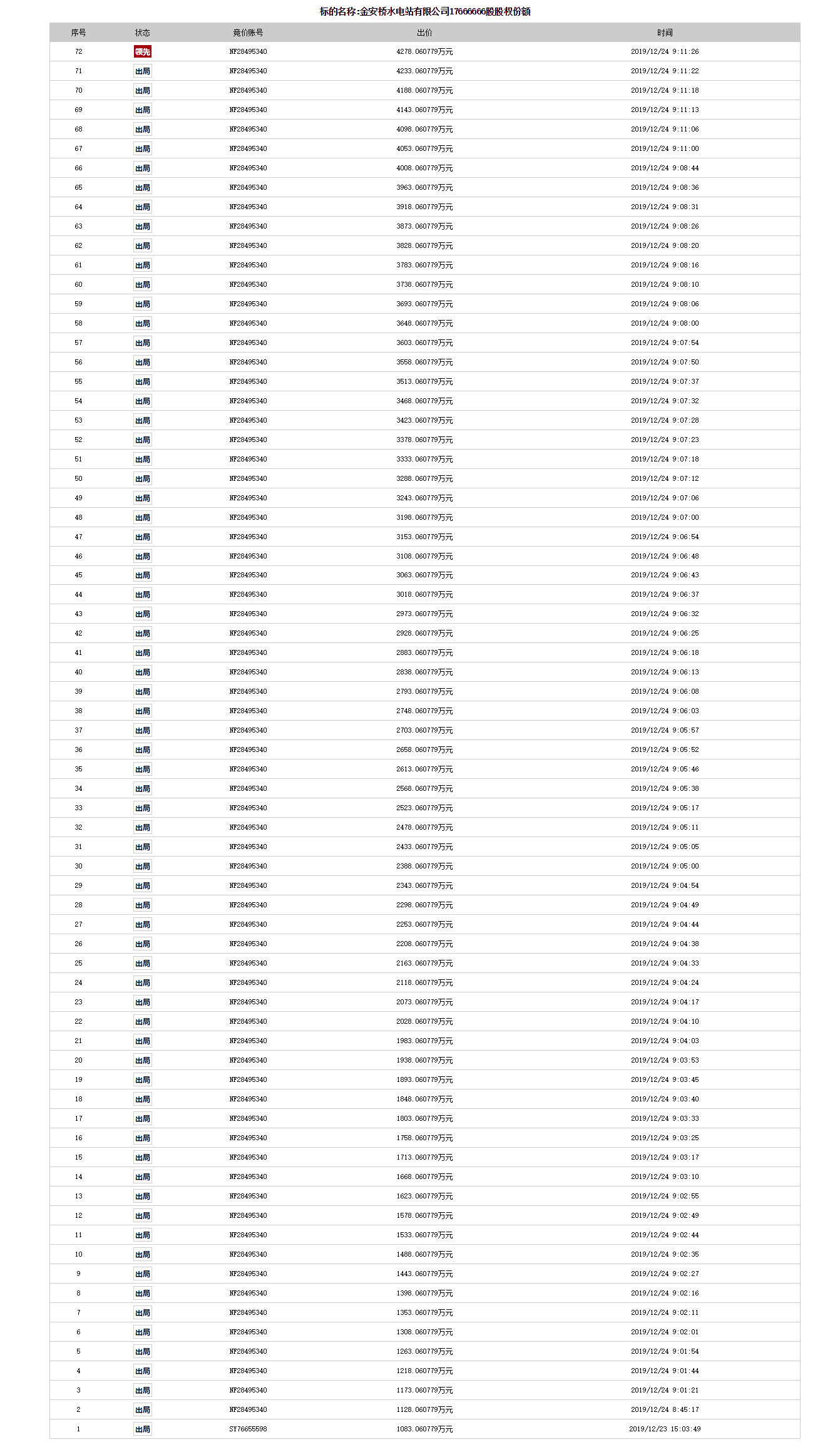 金安桥水电站有限公司17666666股股权份额竞价记录。来源:人民法院诉讼资产网