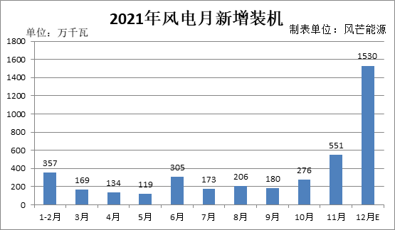 以12月也新增551万千瓦(11月新增值)来算,2021年风电有望实现新增装机30.21GW。