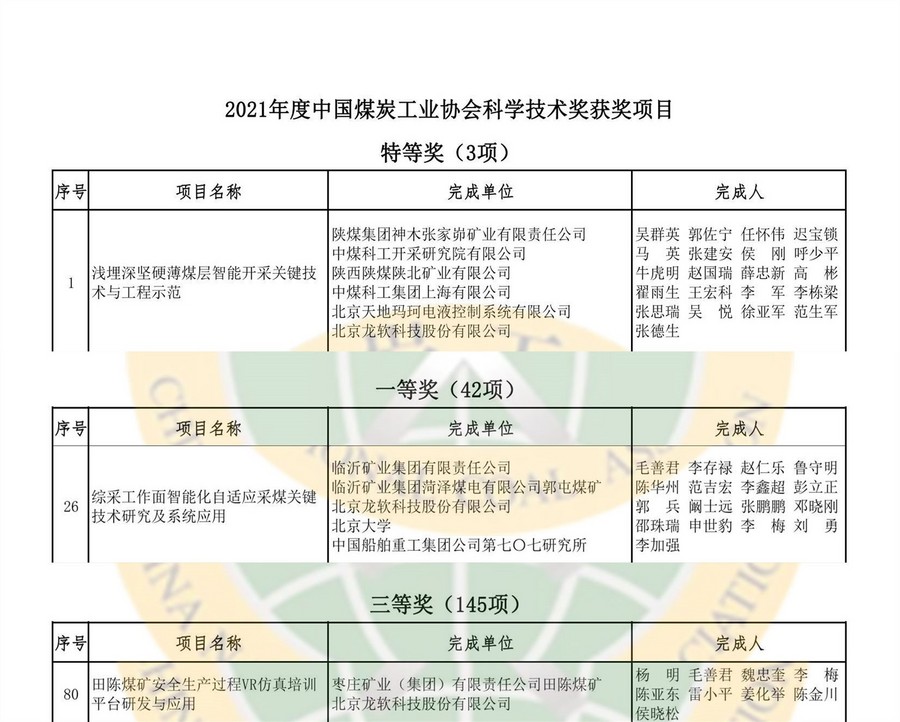 据悉,中国煤炭工业科学技术奖是全国煤炭行业的最高奖项及荣誉,由中国煤炭学会和中国煤炭工业协会主办,每年举办一次。该奖项对中国煤炭工业技术发明成果,推动煤炭工业技术进步的应用开发成果,实现煤炭工业科技成果转化的推广应用成果具有重大意义。