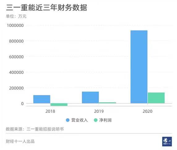 三一重能在2019年打破了多年亏损的局面,当年实现营收14.81亿元,归母净利润1.26亿元;2020年营收93.1亿元,归母净利润13.7亿元;2021年上半年,营收39.48亿元,同比增长65.31%;净利润8.33亿元,同比增长177.92%。