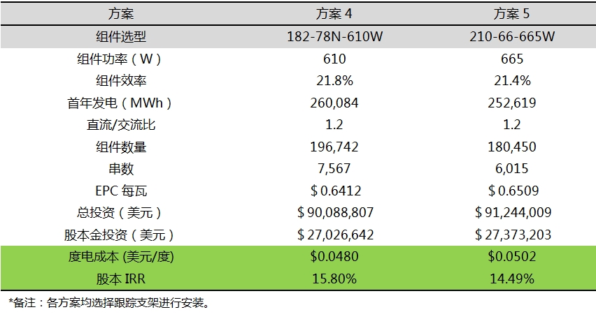 在统一直流侧容量,土地可利用性、系统设计原则和组件价格均确定的情况下,N型产品在国内及西班牙大型地面电站项目的度电成本和投资回报率上都有很大的优势,主要体现在以下方面: