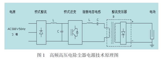 三相工频交流电整流滤波形成直流电→通过逆变电路形成高频电流脉冲→对电流脉冲的周期进行优化控制→电流脉冲通过高频变压器进行升压→对高压电流脉冲进行整流→送电除尘器电场。工艺流程见图1。