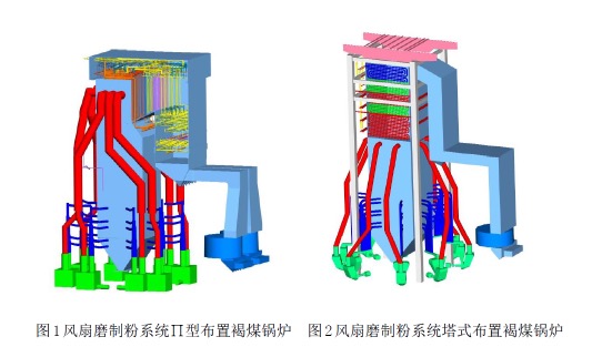 风扇磨制粉系统∏型布置褐煤锅炉和风扇磨制粉系统塔式布置褐煤锅炉示意图分别见图1和图2。两类炉型可根据建设场条件进行选择,在地质条件较好的 场地可以选择塔式布置锅炉,其造价成本低、节约用地,但设备布置高度较高;在地质条件不满足塔式布置要求的情况下可以选择∏型布置锅炉。