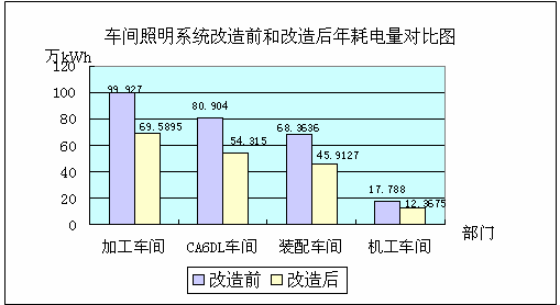 无锡市节约能源监测站对一汽解放公司锡柴分公司绿色照明系统改造项目进行了监测,确认绿色照明系统改造后,平均节电量达28.99%,车间平均照度由原来的247lx提高到275lx,光效由原来的17.16 lm/W提高到现在的25.69lm/W,功率因数达到0.973,照明系统运行电流下降至2.42A。